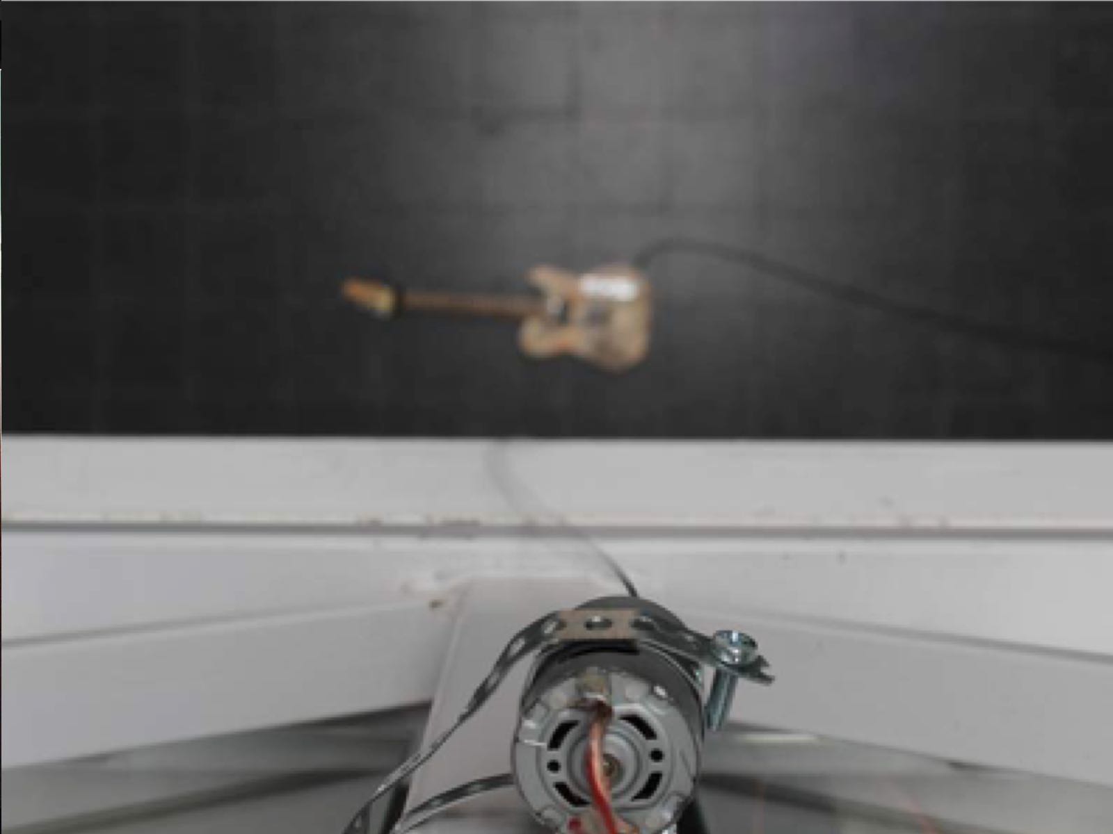 The motor works as a speaker and creator of movement. When the guitar is hit by the steel rope, it creates a signal that will move the rope. When the strings stop to move, the rope will fall down, striking them again. A kinetic feedback