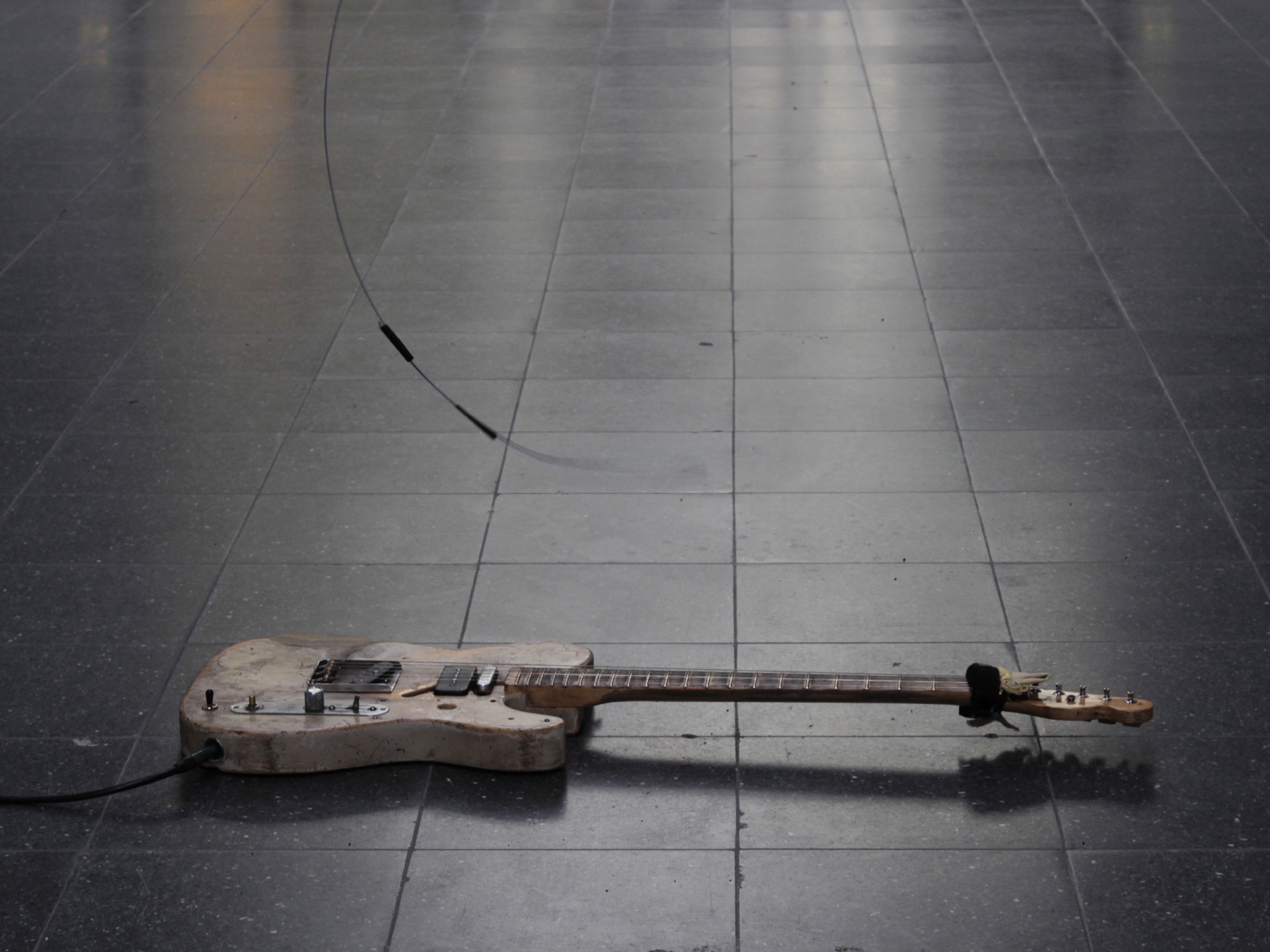 The movement of the sculpture is initiated by a motor which is powered and moved by the audio signal of the electric guitar